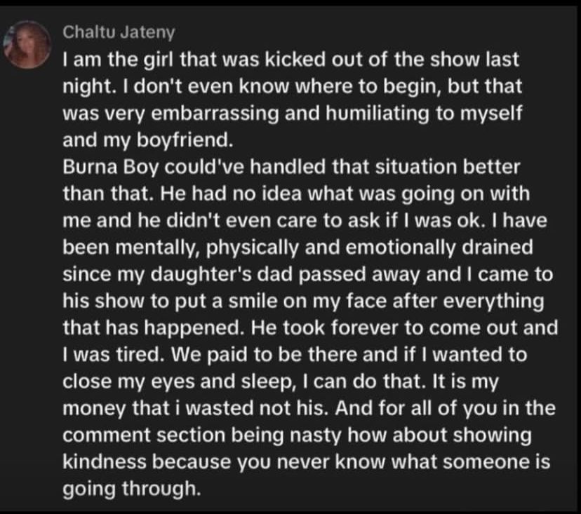 Not long after, the lady at the center of the drama ,Chaltu Jateny spoke up. And boy, did she change the narrative. She shared that she had just lost her daughter’s father and was emotionally, physically and mentally drained. She said she attended the concert to grab one small moment of joy, a little escape from the pain. On top of that, Burna Boy was running late, so by the time he finally took the stage, exhaustion had already won the battle.