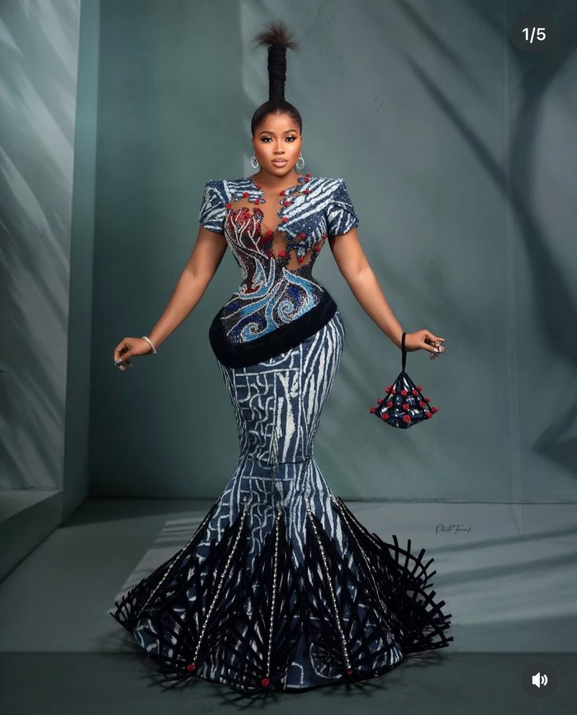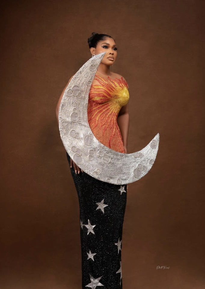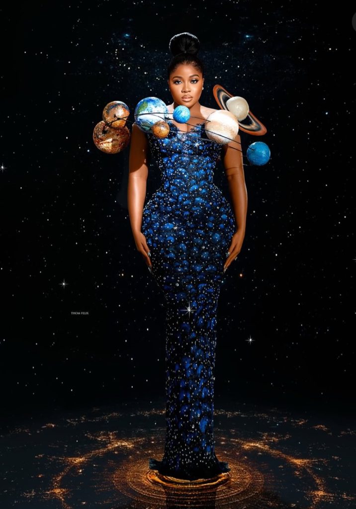 Veteran actress Mercy Aigbe reached for the stars—literally—in a celestial-themed gown adorned with planets, galaxies, and a sweeping train. The Veekee James creation was undeniably eye-catching and ambitious, attempting to capture the entire solar system in one dress. While visually impressive, critics felt it was “beautiful but bloated,” trying to incorporate too many elements. Still, the ambition alone made it unforgettable.