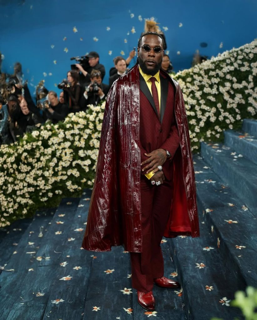 Returning to the Met for a second time, Burna Boy made waves in a red tuxedo paired with a long oxblood eel skin cape. The look was bold, unapologetic, and unmistakably Burna; proving that Nigerian artists don’t need to tone down their aesthetic for international stages.