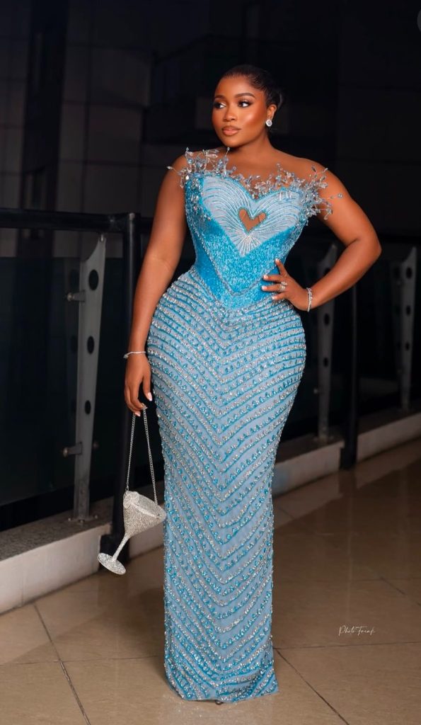 - Day 2: Bukola Crystals’ bold blue gown with heart-shaped cutout and crystal embellishments