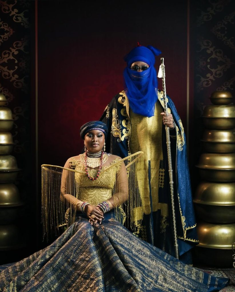 Lateef Adedimeji paid homage to Hausa culture in a majestic blue babariga embroidered with gold, layered with a flowing Rawani turban. His staff of office and contemporary black shades created the perfect balance of tradition and modernity.