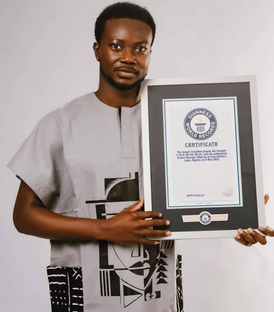 At Lagos’ Terra Kulture, Joshua played the trumpet for over 25 hours, overcoming a disqualified 2024 attempt. Livestreamed to thousands, his performance blended endurance and artistry, inspiring young musicians. GWR certified it in June 2025.